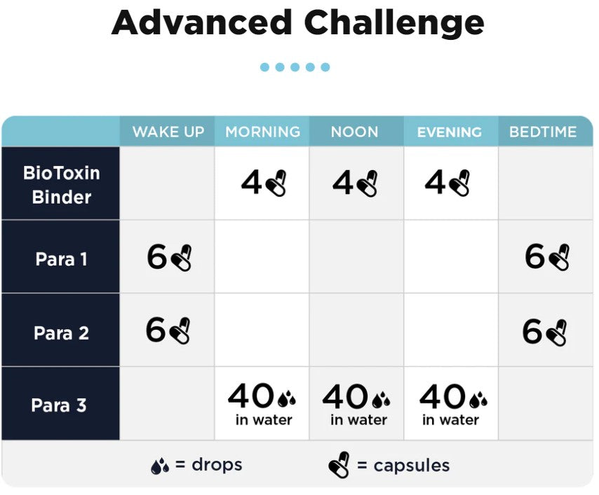 Added Dose: Take 2 extra Para 1 and Para 2, 10 extra drops of Para 3, and 1 extra BioToxin Binder each time you take the products